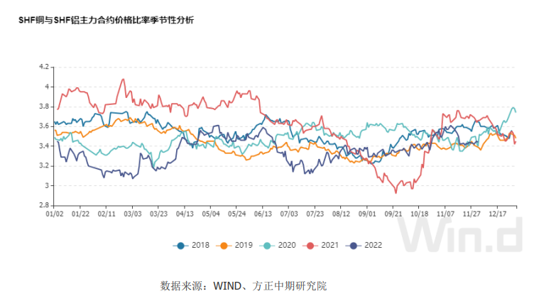 截止至2022年12月05日,滬銅主力合約CU2301收盤價為66,260元/噸,結算價為66,220元/噸;滬合約AL2301收盤價為19,320元/噸,結算價為19,270元/噸。以收盤價計算當前比價為3.43,從季節性角度分析,當前比價較近五年相比維持在較低水平。