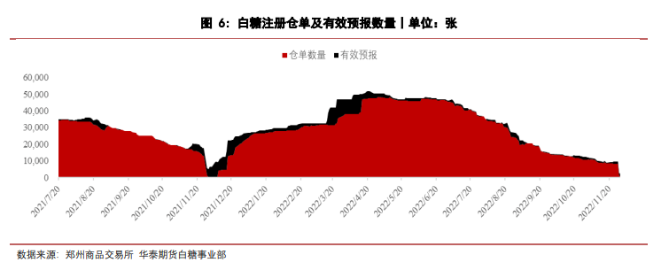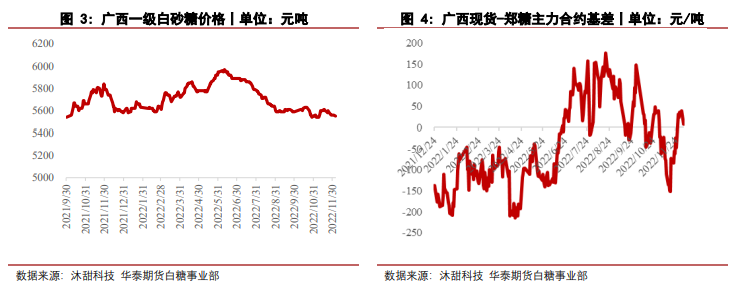 昨日鄭糖主力合約SR2303收盤上漲22元/噸,報5542元/噸。廣西新糖報價持平,報5550元/噸,期現基差8元/噸。注冊倉單數量1132張,較上個交易日持平;有效預報數量1082張,較上個交易日持平。ICE原糖3月合約收盤上漲0.36%,報19.56美分/磅。以原糖3月合約價格計算,配額外50%關稅巴西進口折算成本為6513元/噸,泰國進口折算成本為6858元/噸。