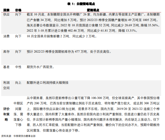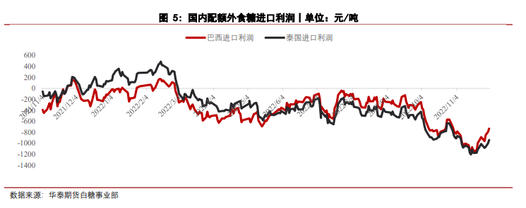 從中期來看,2019/20至2021/22連續三個榨季大量進口,國內積累了大量庫存。雖然目前國內進口利潤嚴重倒掛,但是進口量仍處于歷史高位,并且預計新榨季國內產量變化不大,國內庫存問題并未得到解決,內在缺乏上漲動力。往下看當前配額外進口利潤嚴重倒掛,糖價向下的空間亦不大,預期中期維持區間震蕩,但震蕩重心將會逐步下移。