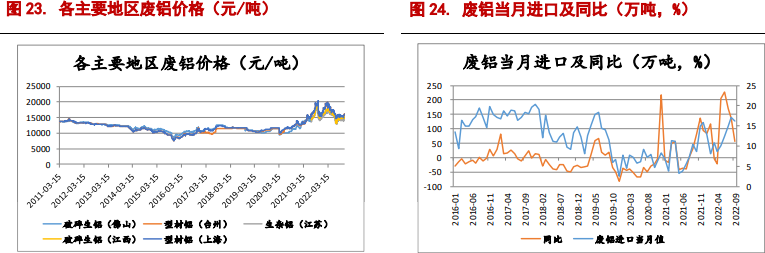 供應端,供應再度收緊。洋山銅溢價下滑至70元/噸,進口量銳減;加工費錄得91.1美元/干噸,較上周上漲1.79%,冶煉產能不及預期。需求端,季節性淡季,消費偏清淡。精廢價差高位盤整,廢銅消費仍然偏強,精銅需求偏弱。庫存端,上期所庫存與LME庫存去庫走緩,維持橫向整理。總體來看,供需表現較弱,基本面支撐走弱。