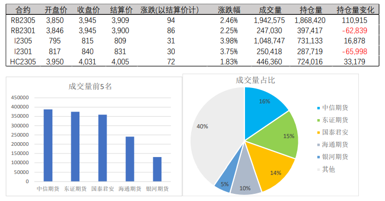 12月9日鋼材期貨日內增倉上漲。其中合約2305,開盤價3,850,結算價3,909,結算價上漲94/2.46%;主力合約2305,開盤價3,950,收盤價4,031,結算價上漲72/1.83%。