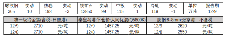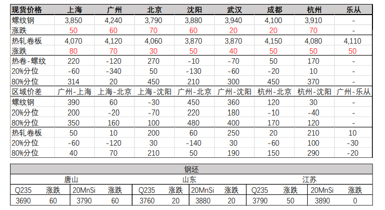 12月9日建筑鋼材方面,全國市場平均價格較上一交易日漲40元,上海市場較上一交易日張50元。方面,全國市場價格較上個交易日漲50元。12月9日全國鋼坯市場價格快速拉漲,期螺拉漲低價市場補庫整體成交尚可。具體表現,唐山鋼坯鋼坯直發資源成交一般尚可,鋼坯倉儲現貨全天較昨上調80元/噸,午前部分資源3750-3780元/噸成交,午后價格進一步拉漲部分資源3780-3790元/噸,12月底3770-2780元/噸成交。下游調坯成品材價格上調30-70元/噸,市場庫存積極整體成交尚可。