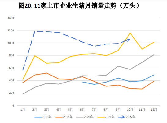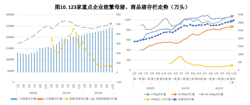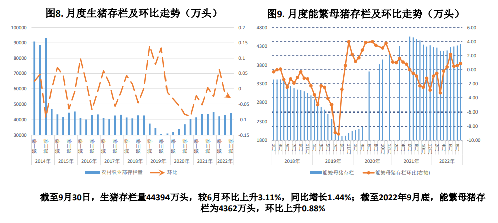 3.庫存:截至9月30日,存欄量44394萬頭,較6月環比上升3.11%,同比增長1.44%;截至2022年10月底,能繁母豬存欄為4379萬頭,環比上升0.39%;我的農產品調查重點企業能繁母豬11月底存欄量為508.93萬頭,環比增1.08%;商品豬存欄3143.41萬頭,環比增2.39%。偏空。