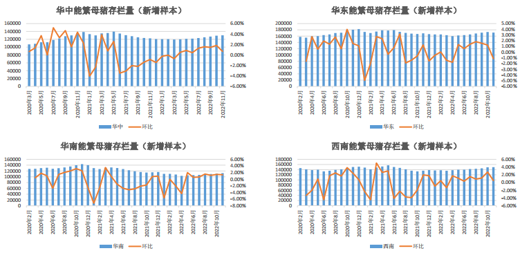 華中(湖南,湖北,安徽,江西)環比增加0.7%;華東(浙江,江蘇)環比減少1.15%;華南(廣東,廣西,福建)環比增加1.36%;西南(云南,貴州,四川)環比增加0.49%;西北(甘肅,陜西)環比增加0.53%。