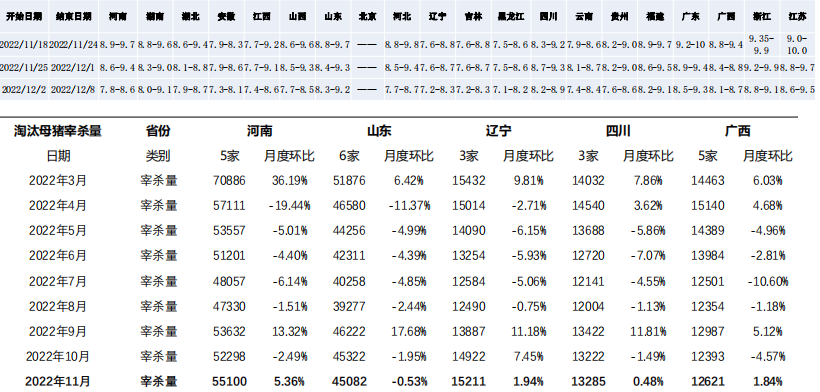 目前從宰量來看,今年整體需求相對疲弱,且12月供應偏高,集團場及散戶出欄預期均較高。受新冠疫情多地爆發影響,市場需求較往年同期明顯惡化。然而盡管12月供需基本確定,但1月行情仍有較大變數,當前提前出欄或透支元旦后出欄量,疊加疫情放開后消費預期好轉,后續不排除反彈行情。短線預計盤面繼續下行,但當前操作風險較大,建議觀望為主。