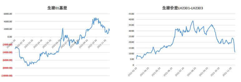 截至12月9日,01合約基差為1700,較上周835上升865點,受需求不及預期影響,期現共振下跌。當前生豬1-3價差收于1125,上周為2380,近月合約受現貨影響大幅下跌,價差持續收窄。