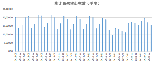 統計局數據顯示,2022年3季度出欄量為15443萬頭,環比下降9.27%,同比下降0.05%。