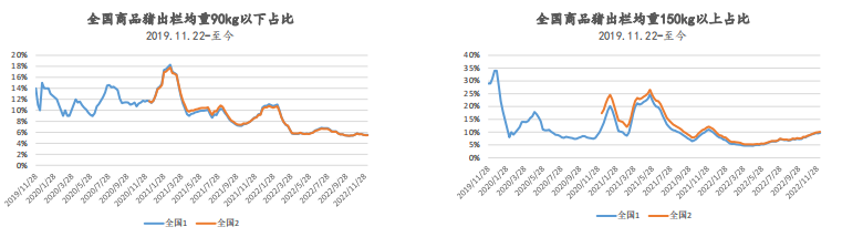 出欄體重:全國商品豬出欄均重90kg以下及150kg以上占比