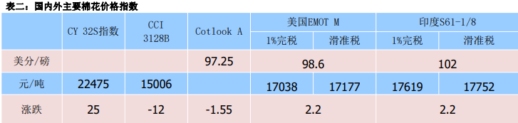 12月14日,現貨指數CCI3128B報價至14959元/噸(+44),期現價差-1119(05合約收盤價-現貨價),滌綸報價6950元/噸(+100),黏膠短纖報價12700元/噸(-50)CYIndexC32S報價22580元/噸(+105),FCYIndexC32S(進口價格指數)報價25162元/噸(+152);鄭棉倉單1262(+307),有效預報350(-170)。美國EMOTM到港價96.4美分/磅(-1.5);巴西M到港價97.3美分/磅(-1.7)截止到2022年12月12日,新疆地區皮棉累計加工總量327.63萬噸,同比減幅20.65%。