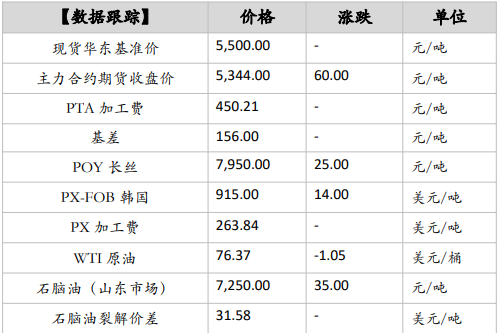 隔夜聚酯震蕩上漲,報+60/+1.14%至5344元/噸,亞洲PX報915美元/噸,PTA現貨加工費為450.21元/噸,PX加工費為263.84美元/噸,石腦油裂解價差31.28美元/噸。