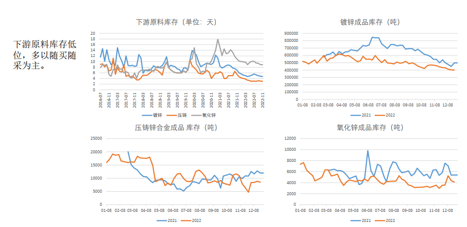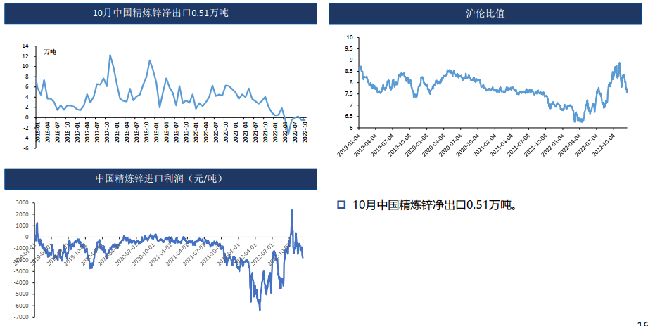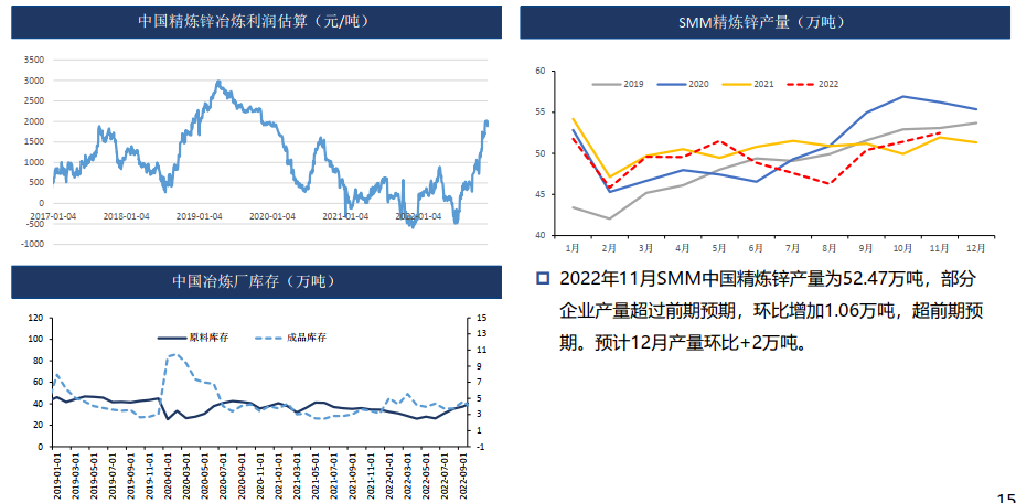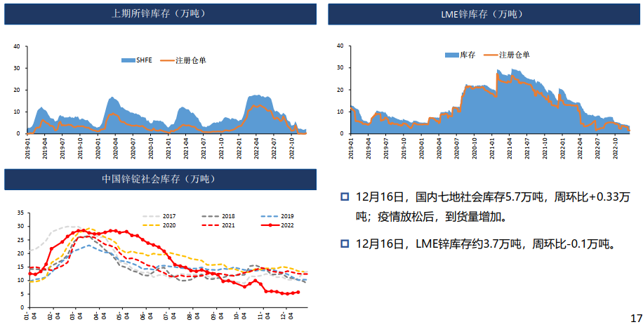四季度國內礦山生產淡季,但進口原料補充,原料供應寬裕,加工費上升明顯,12月精礦加工費5000元/噸,環比上升500元/噸。同時,鋅價高位,冶煉利潤尚可,冶煉開工率上升,預計四季度精煉鋅產量環比持續攀升。四川地區受環保影響消除,冶煉恢復正常生產。需求端,下游進入淡季,部分下游提前放假。歐美通脹高企,居民購買力下降,海外需求同時下滑明顯。當前國內庫存低位,預計疫情管控放松后貨運逐步改善,到貨量或逐步增加,同時下游需求仍偏弱,部分下游提前放假,鋅價偏弱震蕩。