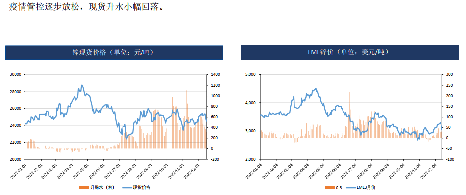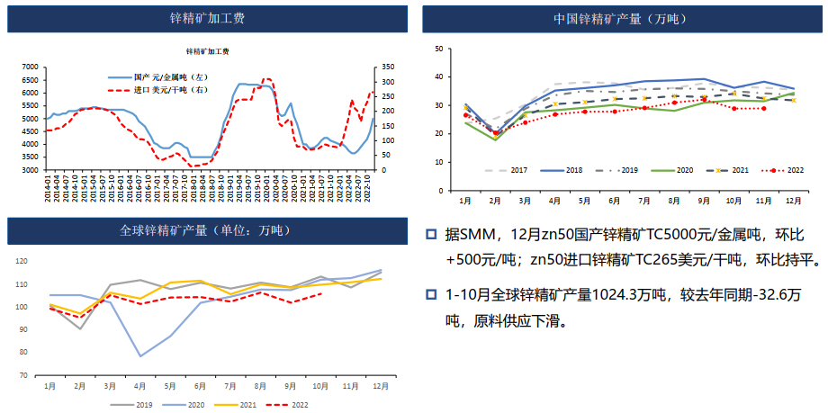 四季度國內礦山生產淡季,但進口原料補充,原料供應寬裕,加工費上升明顯,12月鋅精礦加工費5000元/噸,環比上升500元/噸。同時,鋅價高位,冶煉利潤尚可,冶煉開工率上升,預計四季度精煉鋅產量環比持續攀升。四川地區受環保影響消除,冶煉恢復正常生產。需求端,下游進入淡季,部分下游提前放假。歐美通脹高企,居民購買力下降,海外需求同時下滑明顯。當前國內庫存低位,預計疫情管控放松后貨運逐步改善,到貨量或逐步增加,同時下游需求仍偏弱,鋅價偏弱震蕩。