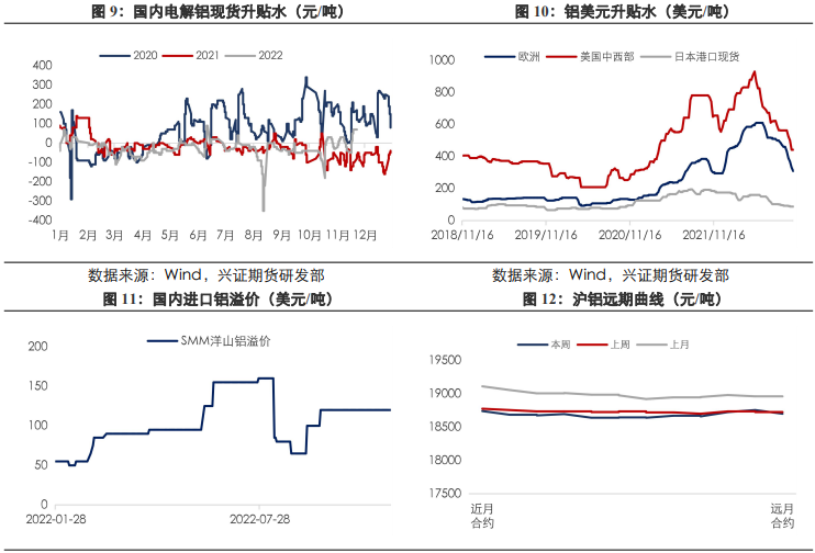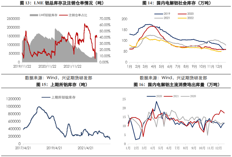 庫存方面,2022 年12 月15 日,SMM統計國內電解鋁社會庫存 48.2 萬噸,較上周四庫存下降1.8 萬噸,較11 月底庫存下降 3.4 萬噸,較去年同期庫存下降42.9 萬噸,電解鋁錠庫存再創新低。