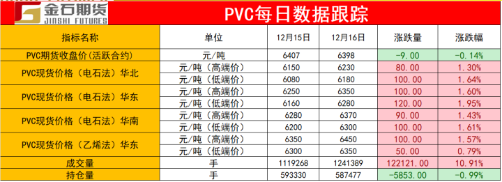 PVC2301合約12月16日收盤價6398元/噸,成交量124.13萬手,較上一日上漲10.91%。持倉量58.74萬手,較昨日下跌0.99%。