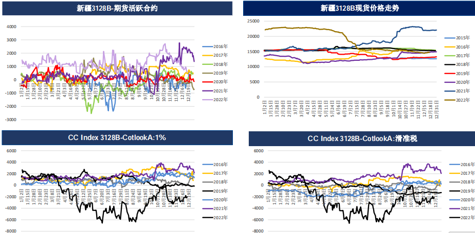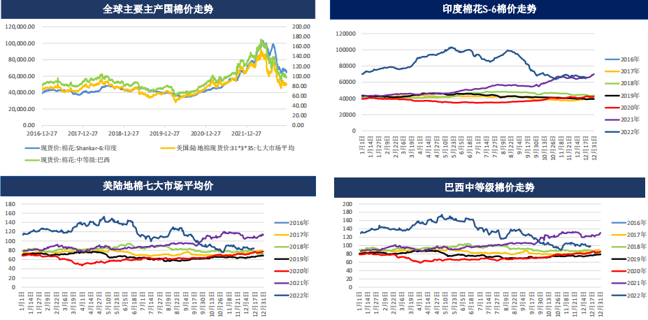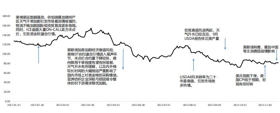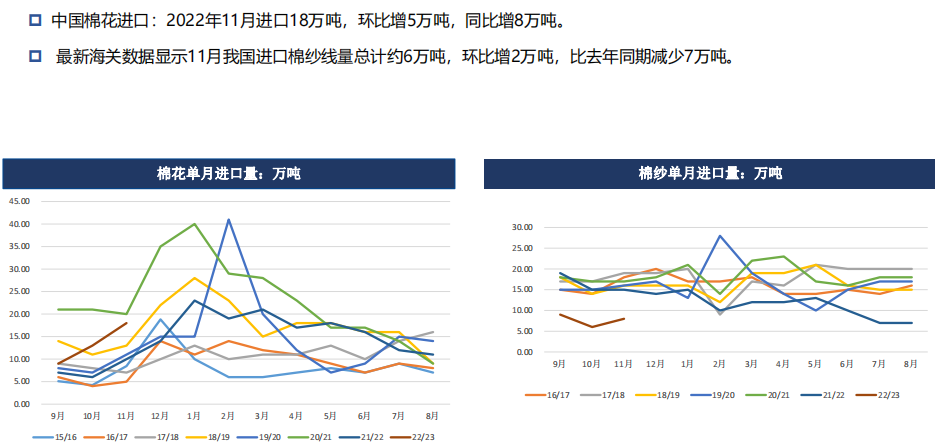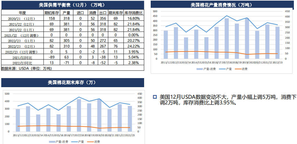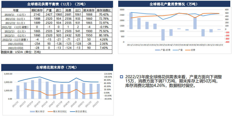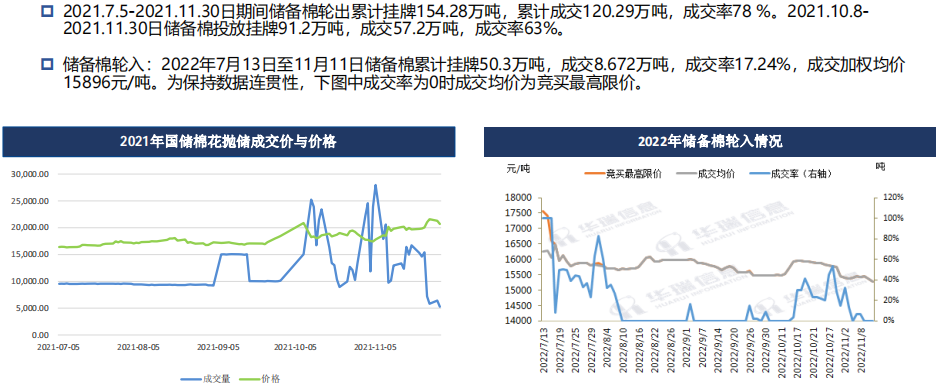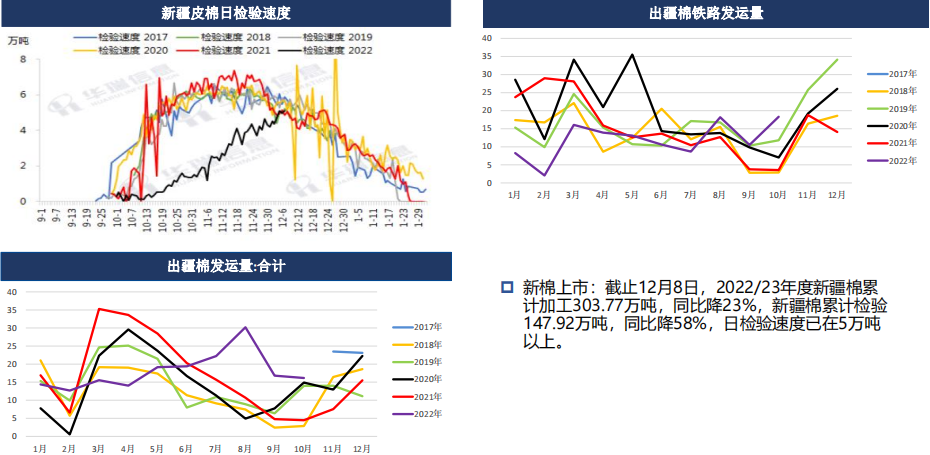 根據美國農業部的統計,截至2022年12月8日當周,美陸地棉合計檢驗量221.39 萬噸,同比降1.7%,占年陸地棉產 量預估值的73.17%(2022/23年度陸地棉產量預估值為295.26 萬噸);皮馬棉合計檢驗量5.55 萬噸,同比增25.5%, 占年皮馬棉產量預估值的 54.2%(2022/23年度陸地棉產量預估值為10.23 萬噸)。周度可交割比例在82.6%,季度 可交割比例在83.5%,環比上周降低0.2個百分點,同比低2.0個百分點,上市速度略有放緩。