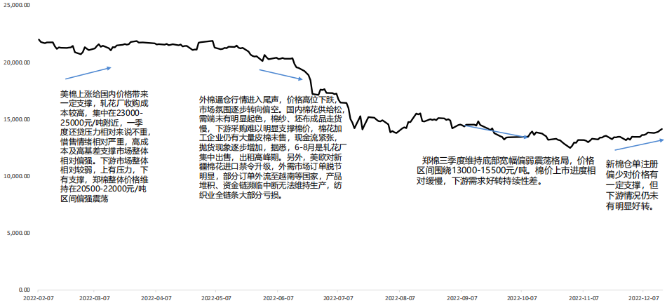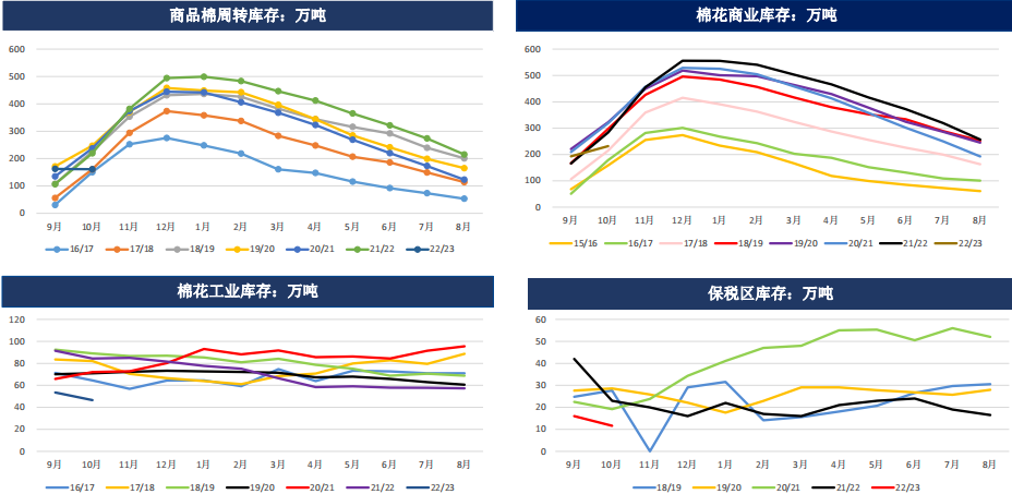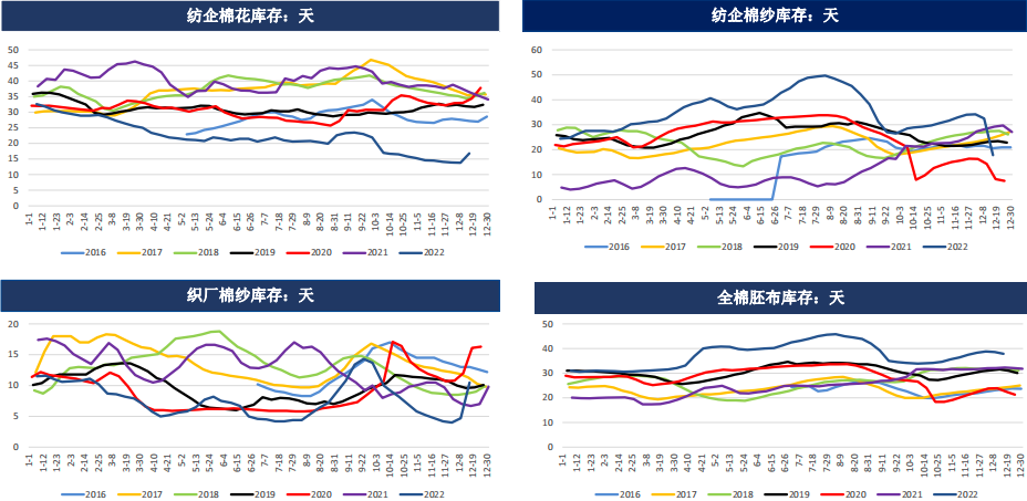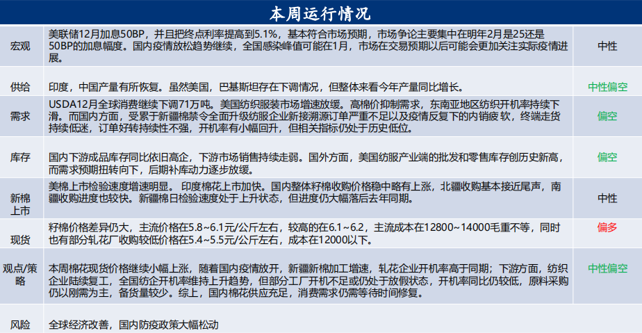 本周棉花現貨價格繼續小幅上漲,隨著國內疫情放開,新疆新棉加工增速,軋花企業開機率高于同期;下游方面,紡織企業陸續復工,全國紡企開機率維持上升趨勢,但部分工廠開機不足或仍處于放假狀態,開機率同比仍較低,原料采購仍以剛需為主,備貨量較少。綜上,國內棉花供應充足,消費需求仍需等待時間修復。