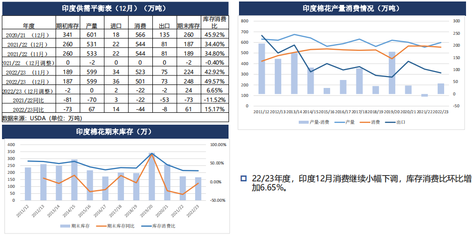 據AGM公布的數據統計顯示,22/23年度印度棉陸續上市。截至2022年12月11日當周,印度棉花周度上市量 11.21萬噸,環比上一周減少2.01萬噸,較三年均值減少約13.0萬噸;印度2022/23年度的棉花累計上市量約 102.05萬噸,較三年均值累計減少約77.55萬噸。