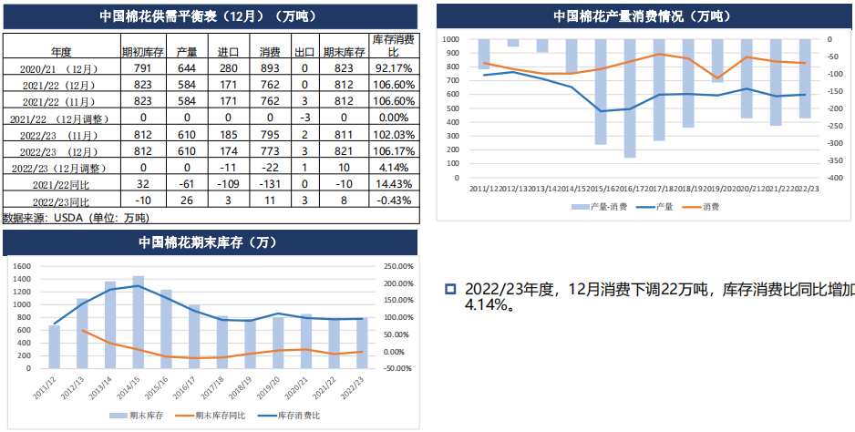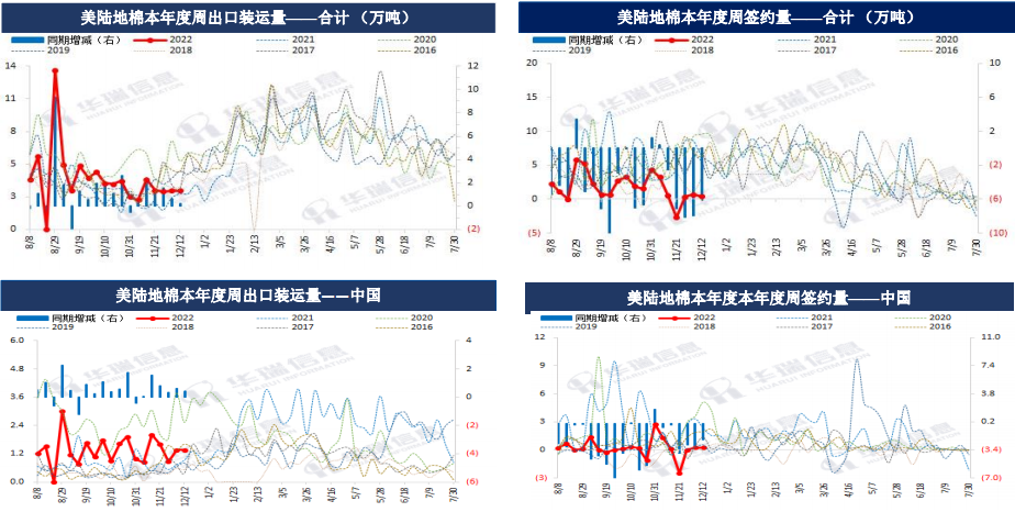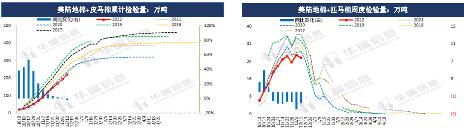 根據美國農業部的統計,截至2022年12月8日當周,美陸地棉合計檢驗量221.39 萬噸,同比降1.7%,占年陸地棉產 量預估值的73.17%(2022/23年度陸地棉產量預估值為295.26 萬噸);皮馬棉合計檢驗量5.55 萬噸,同比增25.5%, 占年皮馬棉產量預估值的 54.2%(2022/23年度陸地棉產量預估值為10.23 萬噸)。周度可交割比例在82.6%,季度 可交割比例在83.5%,環比上周降低0.2個百分點,同比低2.0個百分點,上市速度略有放緩。