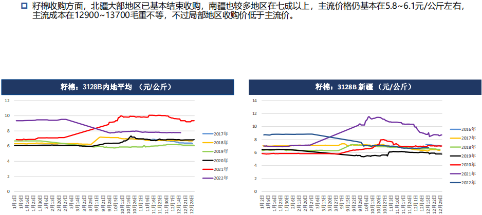 本周棉花現貨價格繼續小幅上漲,隨著國內疫情放開,新疆新棉加工增速,軋花企業開機率高于同期;下游方面,紡織企業陸續復工,全國紡企開機率維持上升趨勢,但部分工廠開機不足或仍處于放假狀態,開機率同比仍較低,原料采購仍以剛需為主,備貨量較少。綜上,國內棉花供應充足,消費需求仍需等待時間修復。