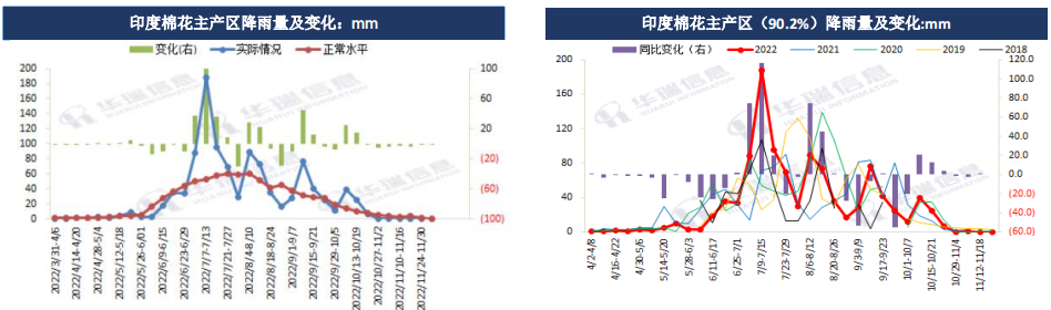 截至2022/12/1至2022/12/7當周,印度棉花主產區(92.4%)周度降雨量為0 mm,相對正常水平低0.8 mm, 相比去年同期持穩。2022/6/1至2022/12/7 棉花主產區累計降雨量為1029.8 mm,相對正常水平高222.1 mm。 本周印度棉花產區保持干燥,有助于棉花收割工作的開展。