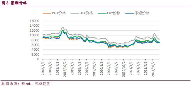 供需結構來看,近期PTA裝置檢修降負增多,開工率維持低位,供應量短期出現下降。而中長期隨著新裝置的逐步投放,供應端壓力依然較大。需求端聚酯各品種利潤在近期開啟修復,同時庫存量環比持續下降,但絕對庫存量同比依然處于高位狀態。終端織造近期開工有所回升,臨近年底尾單增加,訂單需求小幅好轉。