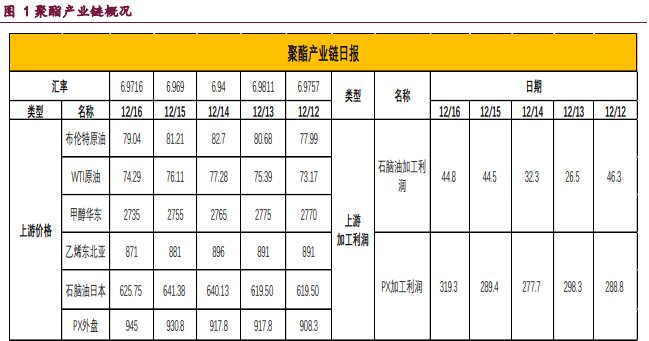 進口方面,海外檢修維持高位,預計12月進口難有增長。需求端聚酯各品種利潤在近期開啟修復,同時庫存量環比持續下降,但絕對庫存量同比依然處于高位狀態。終端織造近期開工有所回升,臨近年底尾單增加,訂單需求小幅好轉。