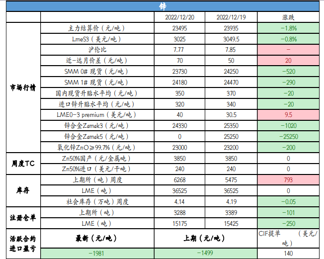 上海 0#鋅今日對 2301 合約報至升水 320-420 元/噸,對 均價升水 70-100 元/噸;廣東 0#鋅對滬鋅 2302 合約升水 680-720 元/噸左右,粵市較滬市升水 190 元/噸;天津 0#鋅對 2212 合約報升水 280-420 元/噸附近,津市較滬市升水 80 元/噸。01-02 價差 70 元/噸,02-03 價差 100 元/噸,內外比價 至 7.62。