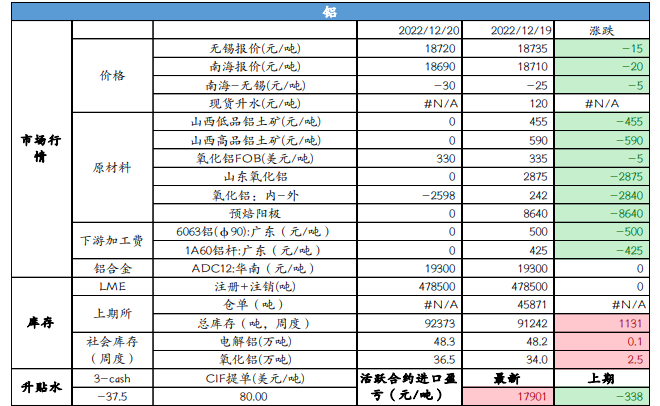 美聯儲加息落地,基本符合市場預期。國內供給端出現新 消息,貴州近期存在超預期減產,但難抵需求回落姿態,下游新增訂單寥廖,部分企業有提前放假情況。供需雙弱格局下, 低庫存效應開始轉弱,支撐不再下鋁價延續弱穩運行。