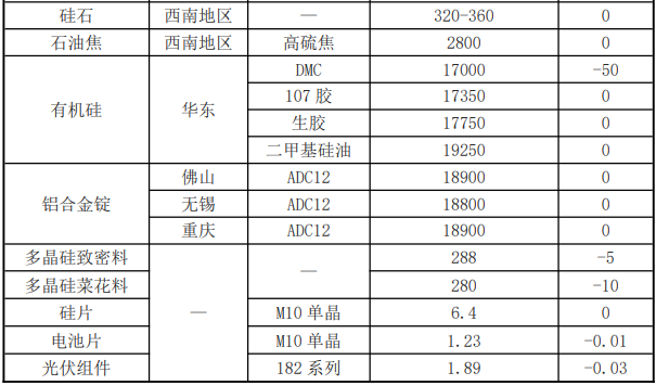 有機硅方面,DMC 平均價 17000(-50)元/噸,107膠17350(0)元/噸,生膠 17750(0)元/噸,二甲基硅油19250(0)元/噸。