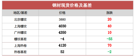 現貨市場方面,報價上調,北京地區螺紋3880漲20,上海地區4030漲40,廣州地區4350漲10,成交環比轉好。
