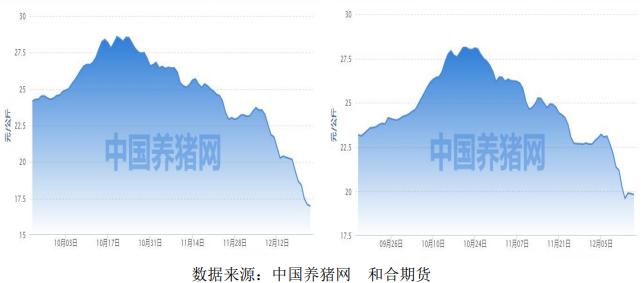 周內生豬價格持續回落。截至 12 月 23 日,全國外三元生豬價格為16.98元/公斤,較前一工作日下跌 0.11 元/公斤,同比上漲5.47%,環比下跌30.81%;全國內三元生豬價格為 16.61 元/公斤,較上一工作日上漲0.09 元/公斤,同比上漲 3.1%,環比下跌 31.28%。