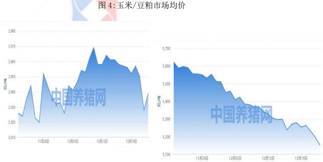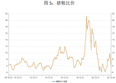 本周價格持續回落。近期進口大豆正值到港高峰期,到港量快速增加,油廠開工保持高位,國內豆粕累庫進度加快,但飼企和貿易商放慢采購節奏,需求端對價格的支撐力度相對有限。據中國養豬網數據顯示,12 月23 日豆粕價格為 5152 元/噸,同比上漲 38.83%,環比下跌 7.82%。豬糧比即生豬價格和飼料價格的比值,豬糧比為 5.85:1。