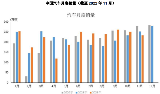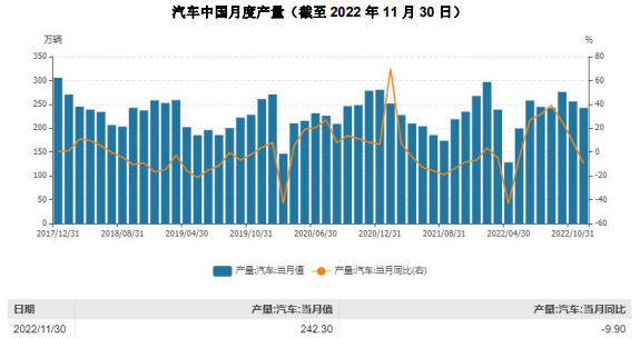 3.據中國汽車工業協會最新數據顯示,2022年11月,中國汽車產銷分別完成238.6萬輛和232.8萬輛,環比分別下降8.2%和7.1%,同比均下降7.9%。