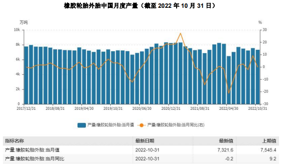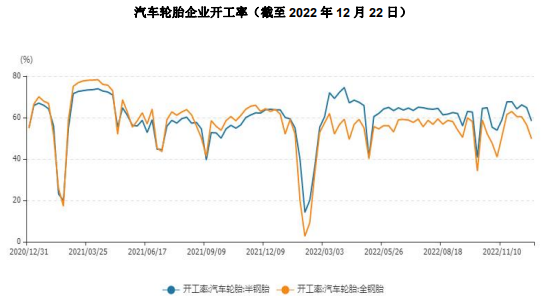 截至2022年12月15日,半鋼胎汽車輪胎企業開工率58.35%,較上周環比下降6.48%;全鋼胎汽車輪胎企業開工率為49.75%,較上周環比下降6.76%。