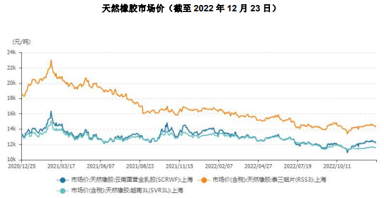 截至2022年12月23日,云南國營全乳膠(SCRWF)現貨價格12150元/噸,較上周下跌400元/噸;泰三煙片(RSS3)現貨價格14250元/噸,較上周下跌400元/噸;越南3L(SVR3L)現貨價格11500元/噸,較上周下跌200元/噸。