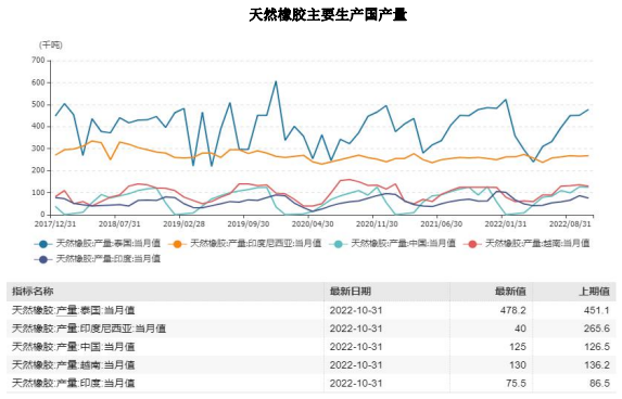 2022年全球天膠產量料同比增加2.3%至1438.2萬噸。其中,泰國增0.9%、印尼增3%、中國增1.6%、印度增12.3%、越南降2.8%、馬來西亞降14.9%、其他國家增8.6%。