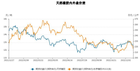 截至2022年12月23日,天然橡膠內外盤價差為216.7元,較上周縮小12.6元。