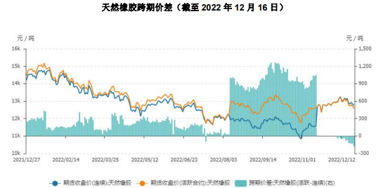 截至2022年12月23日,天然橡膠跨期價差為-175元,較上周增大了110元。