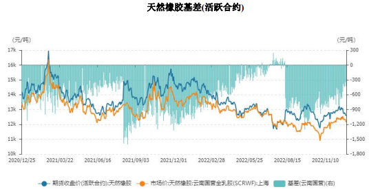以上海云南國營全乳膠(SCRWF)現貨報價作為現貨參考價格,以天然橡膠主力合約RU2305合約期價作為期貨參考價格,二者基差呈現小幅收窄的態勢。