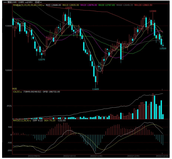 截至2022年12月23日收盤,本周RU2305合約下跌515點,跌幅3.93%,報收12575元/噸。