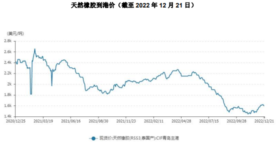 截至2022年12月21日,天然橡膠到港價1600美元/噸,較上周下跌20美元/噸。