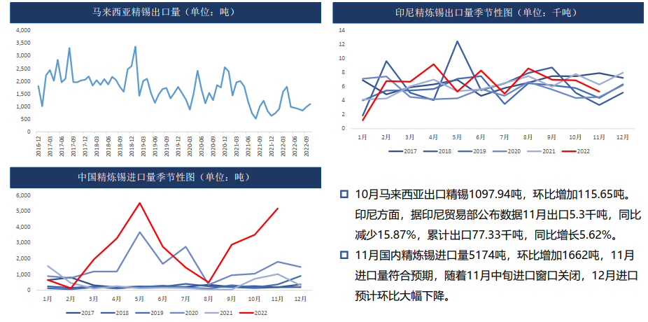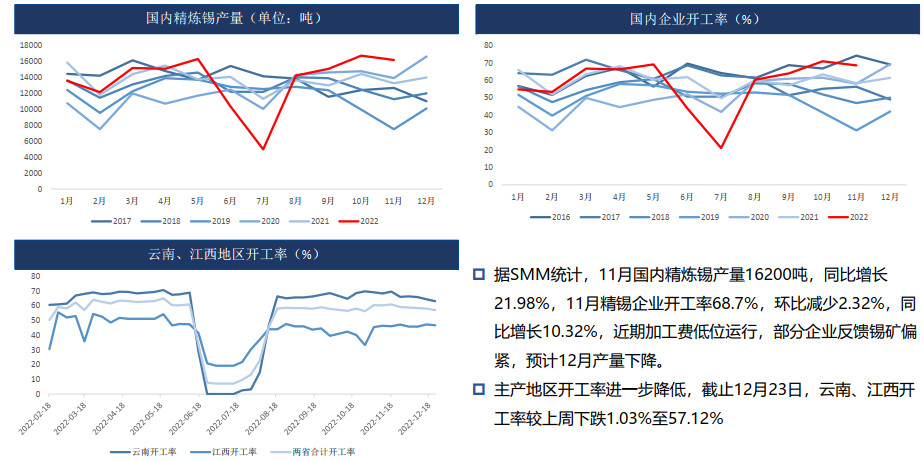 現貨:部分進口錫報價對2月合約貼水700元/噸,而實際成交則對1月合約貼水1000元/噸;國內非交割品牌對2301合約主力合約貼水報價集中于-1500——-500元/噸區間,實際出貨以貼水500——1000元/噸為主;交割品牌早盤對2301合約升貼水集中于+500元/噸上下;云錫品牌早盤報價升貼水集中于+1000元/噸上下,隨錫價反彈,現貨市場成交走弱。