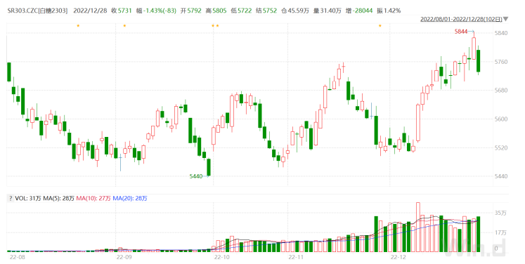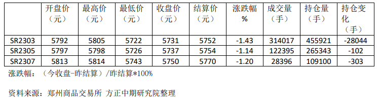 期貨市場:鄭糖回調。SR303在5722-5805元之間波動,收盤下跌1.43%。