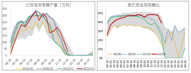 巴西:巴西蔗產聯盟UNICA最新雙周數據顯示,2022年12月上半月巴西中南部地區產糖29.8萬噸,同比增加1147.96%。2022/23年度已累計產糖3329.2萬噸,同比增加3.84%。本年度累計制糖比為45.93%,同比上升0.9個百分點。