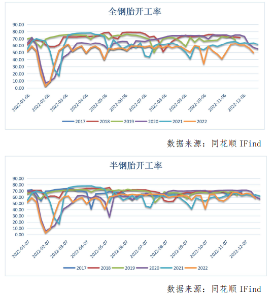 截至(12月16日-12月22日)當周中國半鋼胎樣本企業開工率為58.72%,環比-8.40%,同比-6.63%;中國全鋼胎樣本企業開工率為55.36%,環比-7.62%,同比-8.70%。半鋼胎庫存周轉天數在48.95天,環比上周期-0.17天;全鋼胎樣本企業平均庫存周轉天數在48.69天,環比上周期+0.06天。