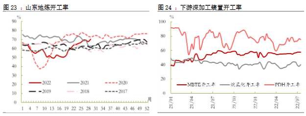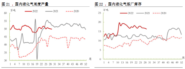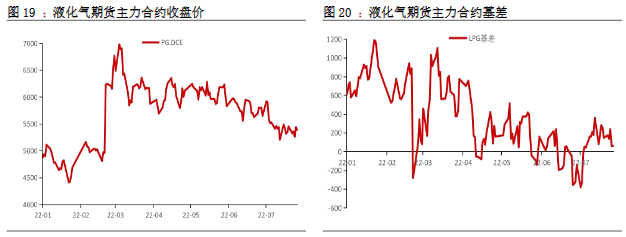 3.需求:民用燃燒需求,考慮目前處于消費淡季,短期終端消費動力或不足。化工需求,由于國內疫情反復,預計整體偏淡。本周,國內烯烴深加工裝置平均開工率46.18%,環比下降0.03pct;烷基化開工率43.76%,環比持平;MTBE全國開工率59.82%,環比增長5.06pct;PDH裝置周內均開工率71.65%,環比上升0.4pct。