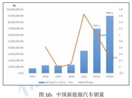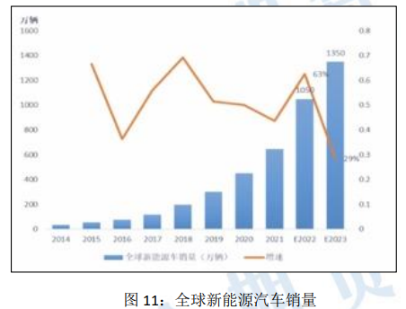 2022 年 1-10 月,全球新能源車累計銷量為 775.07 萬輛,占市場份額13%,預計 2022 全年新能源車銷量約為 1050 萬輛,同比增加63%,2023 年全球新能源車銷量為 1350 萬輛,同比增加 28.5%。國內方面,2022 年雖然我國新能源車銷售受疫情和原料價格上漲影響出現一定回落,但政府支持政策頻出,根據中汽協數據顯示,2022 年 1-11 月,我國新能源汽車產銷分別完成625.3 萬輛和606.7萬輛,同比均增長 1 倍,市場占有率達到 25%。另外根據中信部等四部門2021年 12 月發布的公告,在我國已執行 13 年之久的新能源汽車購置補貼將于2022年 12 月 31 日終止。雖然短期對新能源車的銷售造成一定影響,但市場需求已經真正形成,財政補貼退出的影響已經弱化。尤其在價格高漲的情況下,人們從經濟的角度出發,選擇新能源車的比例大幅增加。預計2023 年,我國新能源車銷量將達到 900 萬輛,同比增加 30%,市場滲透率將達到32.6%。