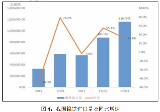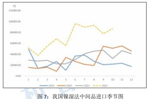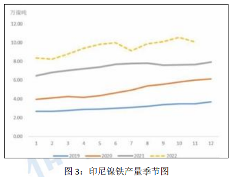 2022 年,我國鎳鐵進口量維持高速增長,其中主要進口來源國就是印尼,根據海關數據顯示,2022 年 1-10 月中國鎳鐵進口總量467.9 萬噸,同比增加158萬噸,增幅 51%,其中自印尼進口 430 萬噸,同比增加168.5 萬噸,增幅64.4%。預計 2022 全年中國鎳鐵進口總量大 88 萬鎳噸,同比增加55.45%。