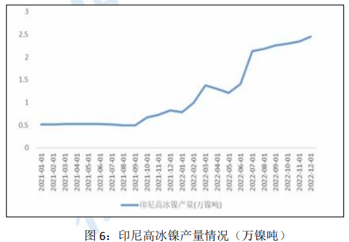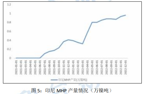 隨著印尼 MHP 項目投產放量,2022 年全年印尼 MHP 產量月8.6 萬金屬噸,同比增長約 5 倍,我國進口量同步放大,根據海關數據統計,預計2022 全年我國鎳濕法中間品進口量達 91.36 萬噸,同比增加 120.67%。高冰鎳進口量也同比增長了約 9 倍。