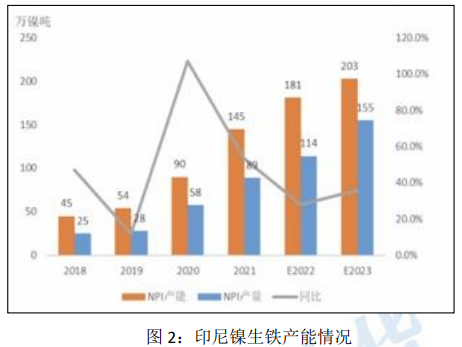 2022 年,印尼新增投產節奏較快。根據 smm 數據,2022 年1-11 月,印尼鎳鐵產量累計 104.38 萬噸,同比增加 28.64%,預計 2022 年印尼鎳鐵產量114.57萬噸,同比增加 25.51 萬鎳噸,增幅 28.64%。2023 年,印尼新增鎳鐵產能超過50 萬金屬噸,預計其全年鎳鐵產量或增至 155 萬鎳噸,同比增加40 萬鎳噸,增幅 35.3%。